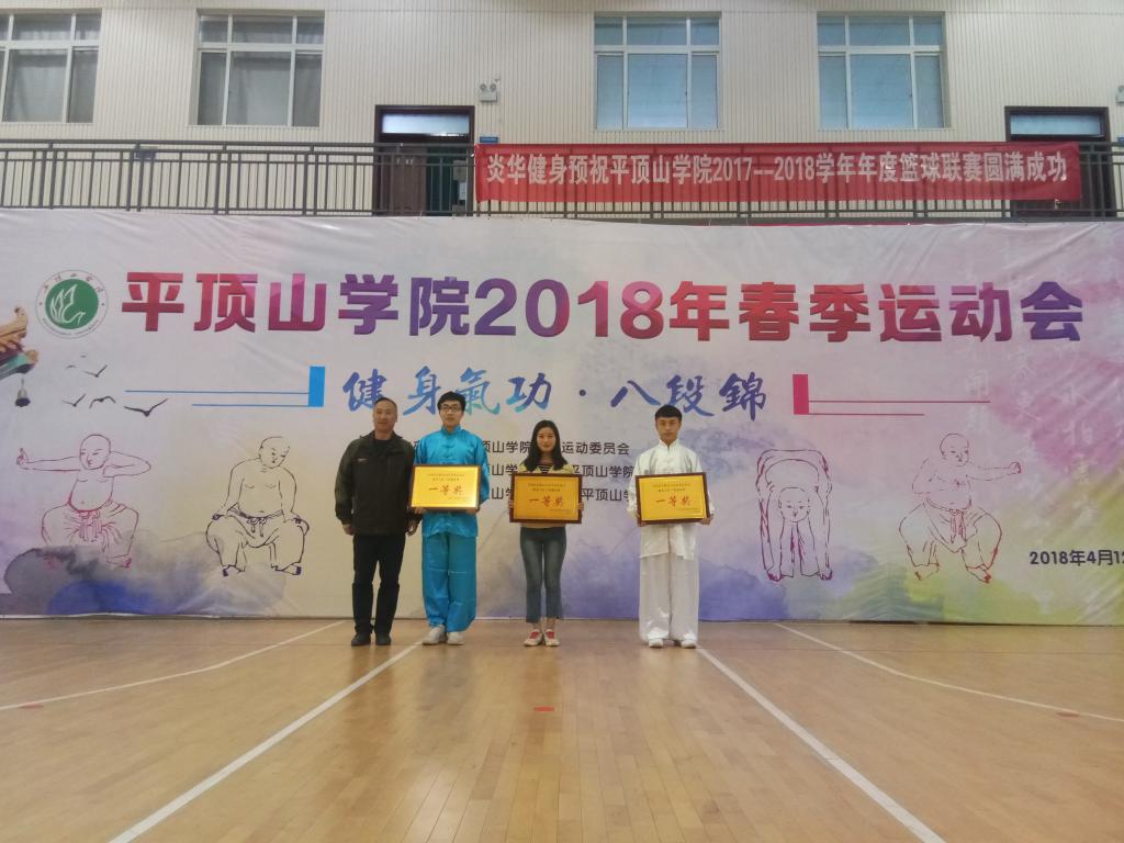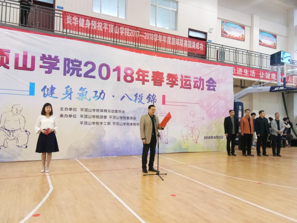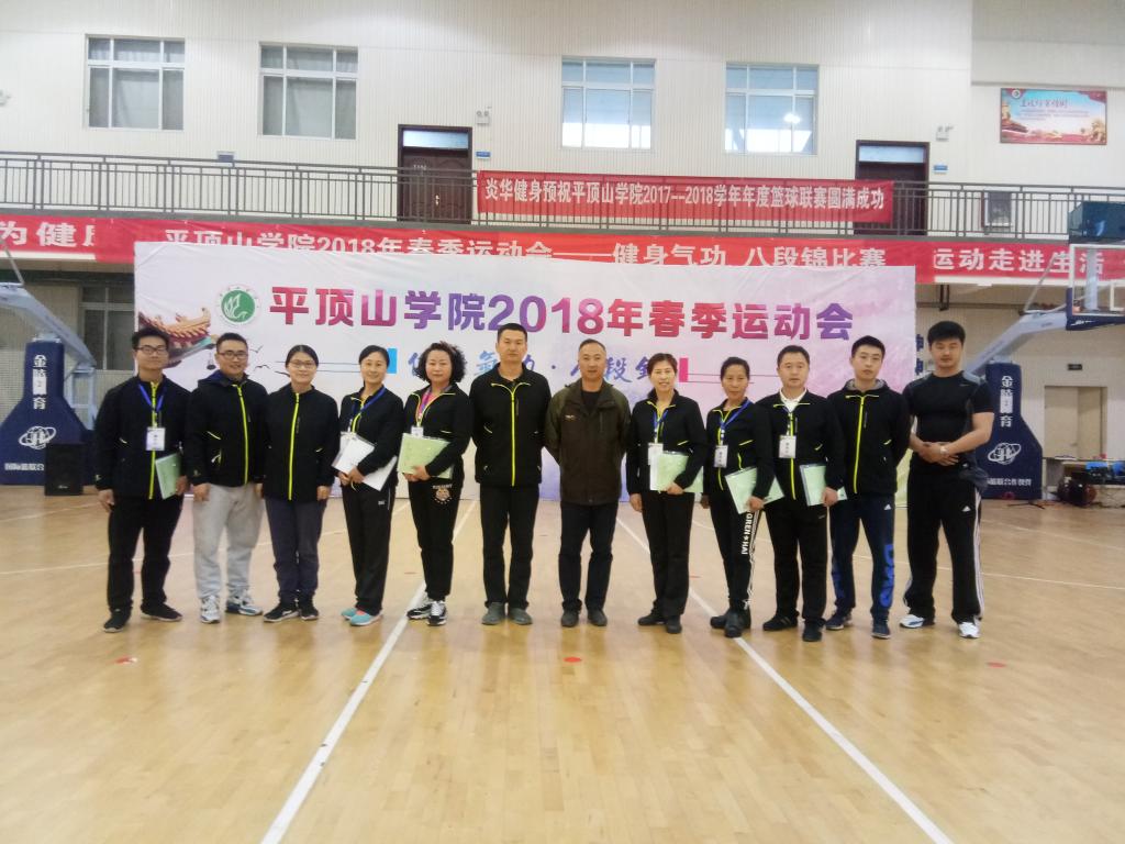 4月 12日下午,由beat365官网体育运动委员会主办,beat365官网团委、教务处、学工部、beat365官网承办的beat365官网2018年春季运动会健身气功·八段锦比赛在体育训练馆圆满落幕。校团委副书记王刘涛、beat365官网党总支书记马书军、副院长王继强、孔祥出席了此次比赛,全校共有15支队伍参加。